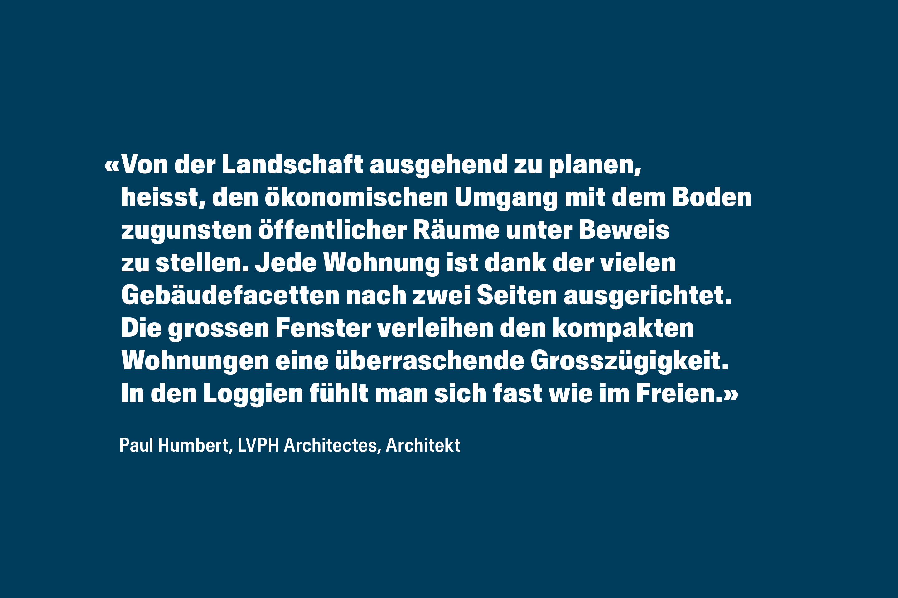 Auf dieser zentral gelegenen Parzelle der Gemeinde sind neben dem Park vier Wohnhochhäuser entstanden. Die bis 30 m hohen Häuser ermöglichen Innenverdichtung und spielen Parkfläche frei. Sie bieten über einem Sockelgeschoss mit öffentlichen Nutzungen einen breiten Wohnungsmix mit Blick ins Grüne. 40 der 170 Wohnungen sind altersgerecht und stehen Menschen zur Verfügung, die auf Ergänzungsleistungen angewiesen sind. Im Erdgeschoss ist eine Kinder­tagesstätte eingezogen. Ein grosser Gemeinschaftsraum dient als generationenübergreifender Treffpunkt für die Bewohnenden.