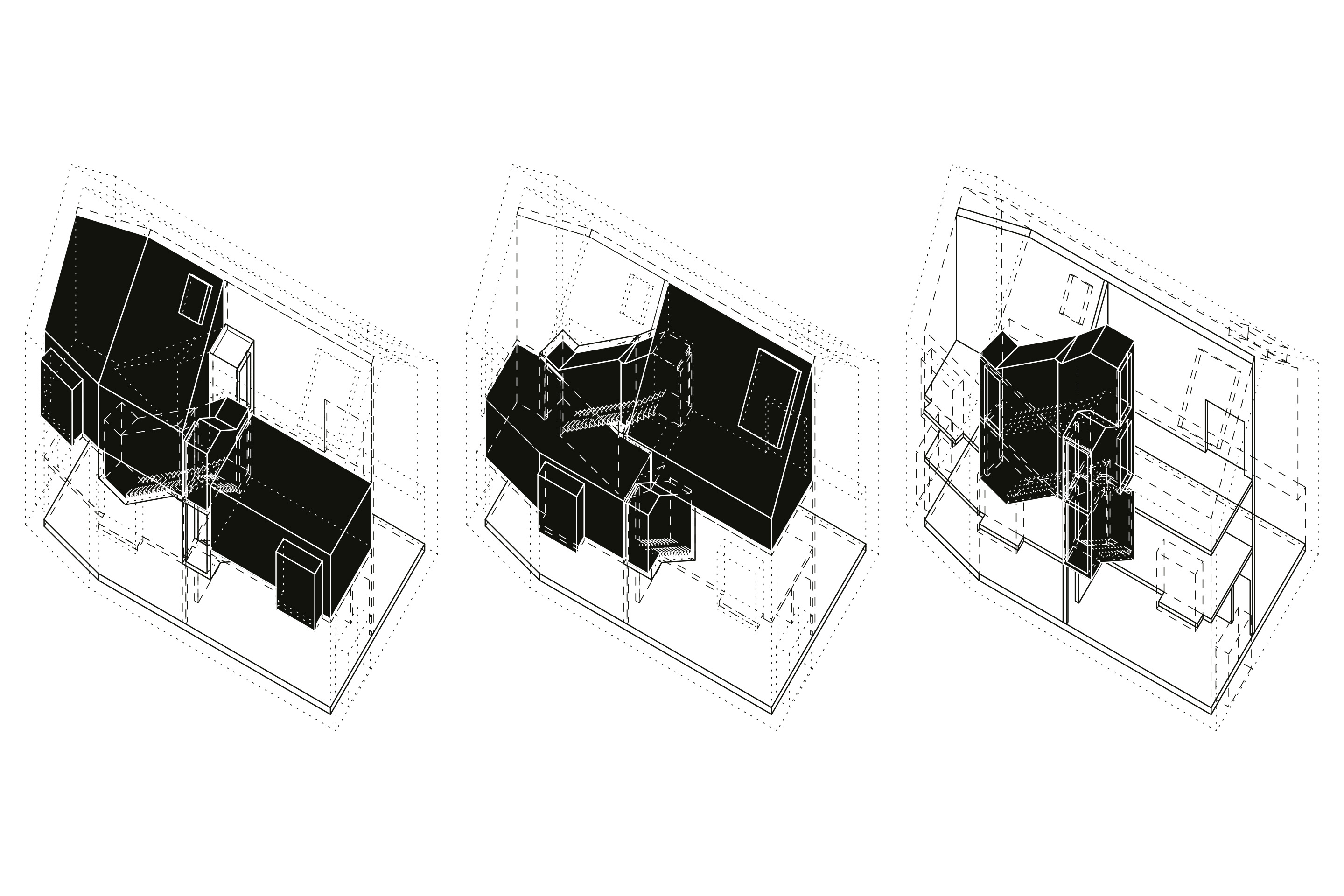 The building’s main volume is a simple parallelepiped, whose only variation is the slight chamfer at the junction of the north and west façades. This subtle articulation is echoed in the roof, consisting of two equal-width, unprojected slopes that bend to accommodate the shift.