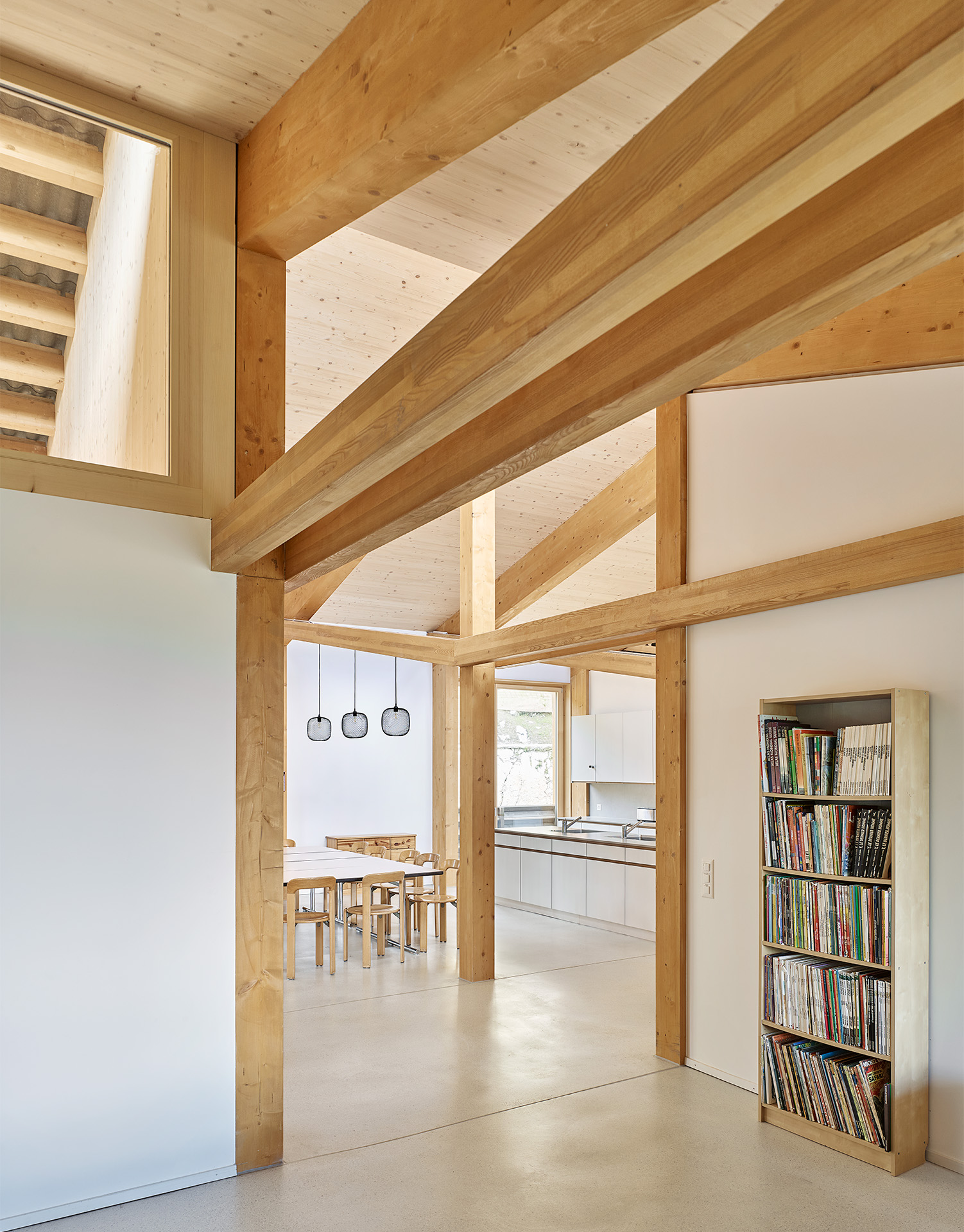 Die geneigten Zangen an der Südfassade entlasten die Stützen in der Aussenwand, fassen den Aussenbereich im oberen Geschoss und halten gleichzeitig den Sonnenschutz für die Sporthalle. Sie fussen in kleinen Betonsockeln, die auf der neuen Steinmauer liegen. «Holz mag keine nassen Füsse», erinnert Olalla Lopez von bunq, die die Baustelle leitete. Die Neigung des Portikus erinnert an die Bauweise ländlicher Gebäude im Kanton Freiburg und im Waadtland, die bunq bereits zehn Jahre zuvor in ihrem Wohnprojekt für die Institution Lavigny umgesetzt hatte. Hier ist die Geste jedoch nicht nur zweidimensional ausgestaltet, sondern gewinnt eine Reife und dreidimensionale Kraft, die der engen Zusammenarbeit zwischen Architektur und Statik zu verdanken ist.