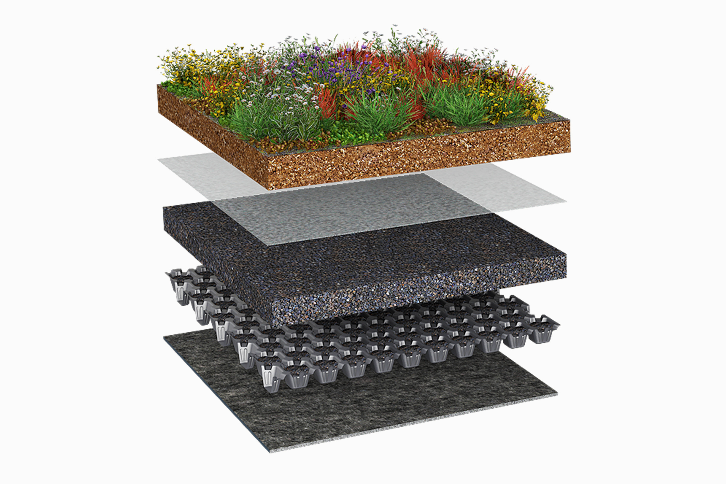 Ein weiterer Vorteil: Systeme, die über eine Kapillarwirkung verfügen, können das in den Retentionselementen zurückgehaltene Regenwasser in die Substratschicht zurückführen. So steht dieses gerade während Hitze- oder Trockenperioden den Pflanzen zur Verfügung und verdunstet.