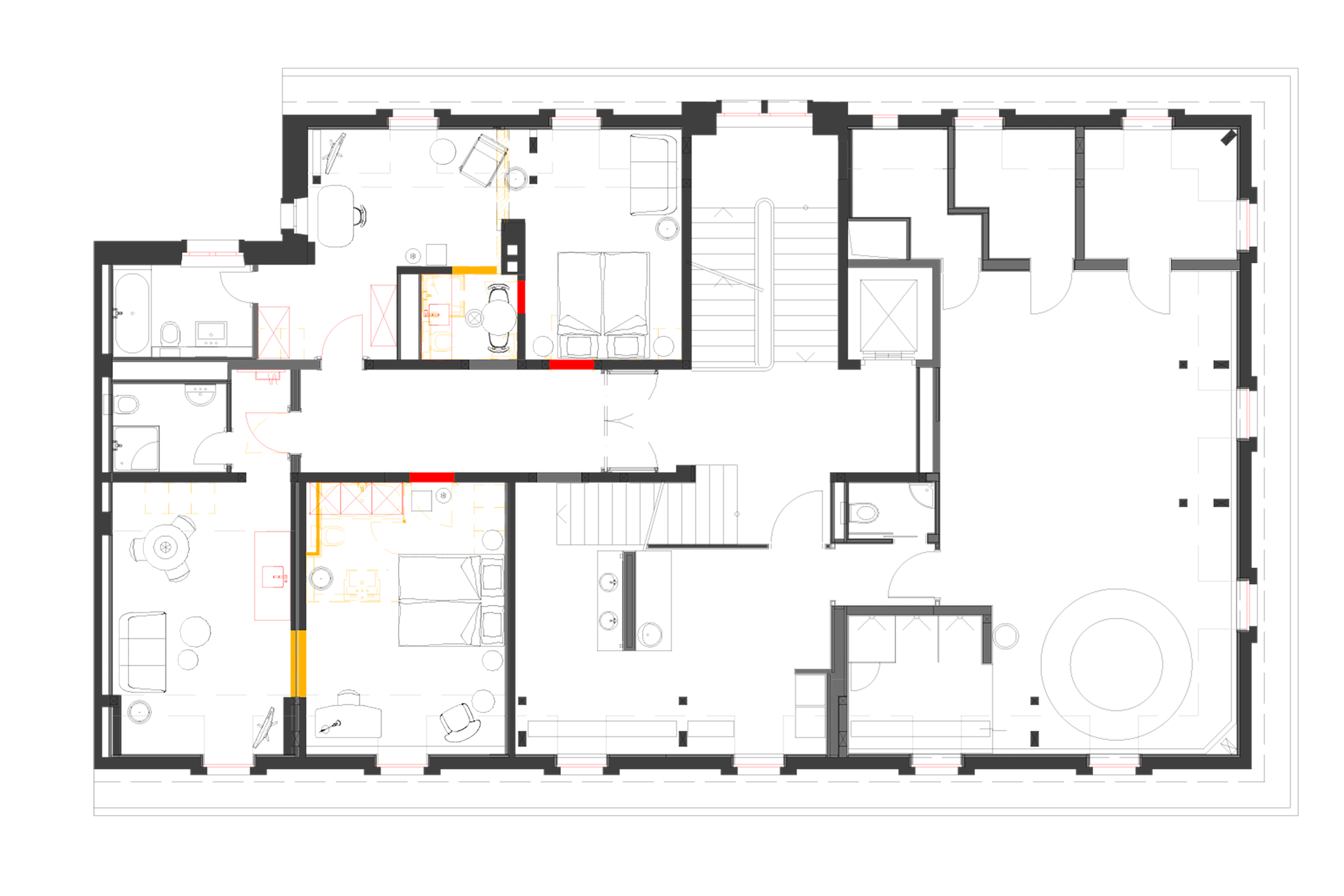 Gleichzeitig erweitert sich das Hotel programmatisch. Aus 28 Zimmern werden 16 – ergänzt durch Apartments, Familienzimmer und ein ganzes Geschoss für Longstay Gäste. Das ist mehr als ein betrieblicher Entscheid. Es ist eine Verschiebung des Typus: vom temporären Aufenthalt hin zu Formen des Wohnens. Dafür wurden Zimmer zusammengelegt, Apartments mit Küchen eingeführt.