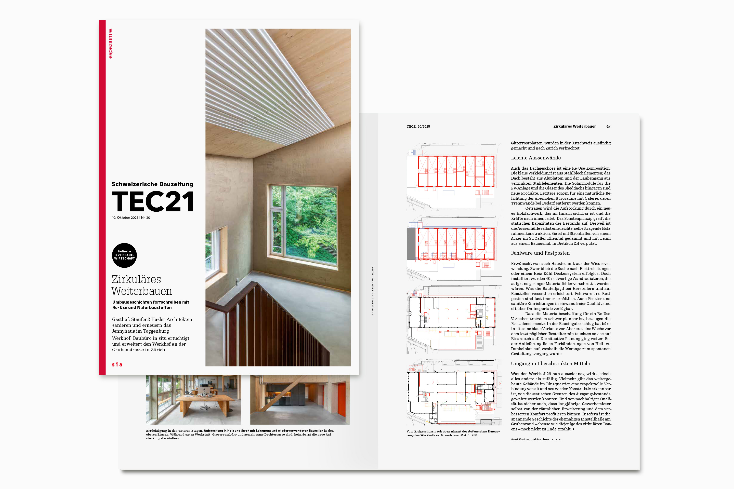 Staufer & Hasler Architekten gingen im Toggenburg den verschiedenen Zeitschichten des Jennyhauses nach. Mit einem Teilersatz in traditioneller Holzbauweise und einer Anpassung der Geschosshöhen im Altbau erweckten sie das Gasthaus zu neuem Leben. Die alte Einrichtung wurde aufgefrischt und wird weitergenutzt, auch aufgrund des Kostendrucks. Noch weiter geht baubüro in situ mit dem Werkhof 29 auf dem Zürcher Binz-Areal. Hier spielen Sanierung, Re-Use und Dachaufstockung mit Holz, Stroh und Lehmputz zusammen. Die Beispiele zeigen: Wer die ganze Klaviatur der Kreislaufwirtschaft zu spielen vermag, schafft Bauten, in denen Altes und Neues verschmelzen und die den Weg in die Zukunft weisen.
