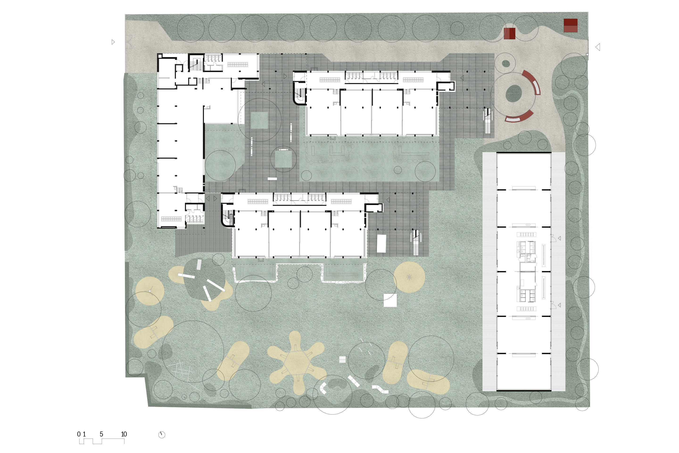 At the entrance, the project defines the Walnut Square, a collective outdoor space that extends the school’s activities. Arranged around an existing walnut tree, the square is designed as a hemicycle with built-in seating and planting beds in pigmented concrete. The nearby playground, shaped around the theme of a clearing, features garden areas with flowers and native species. Environmental considerations are addressed through a green roof and natural ventilation assisted by passive systems. The project is conceived as a functional device, combining adaptability, durability, and a careful approach to sustainability. The entire intervention forms a compact educational campus immersed in greenery, where the new building appears as a modest, seamless continuation of the original complex. Its apparent simplicity conceals a precise orchestration of construction and typology, ensuring maximum flexibility and spatial clarity.