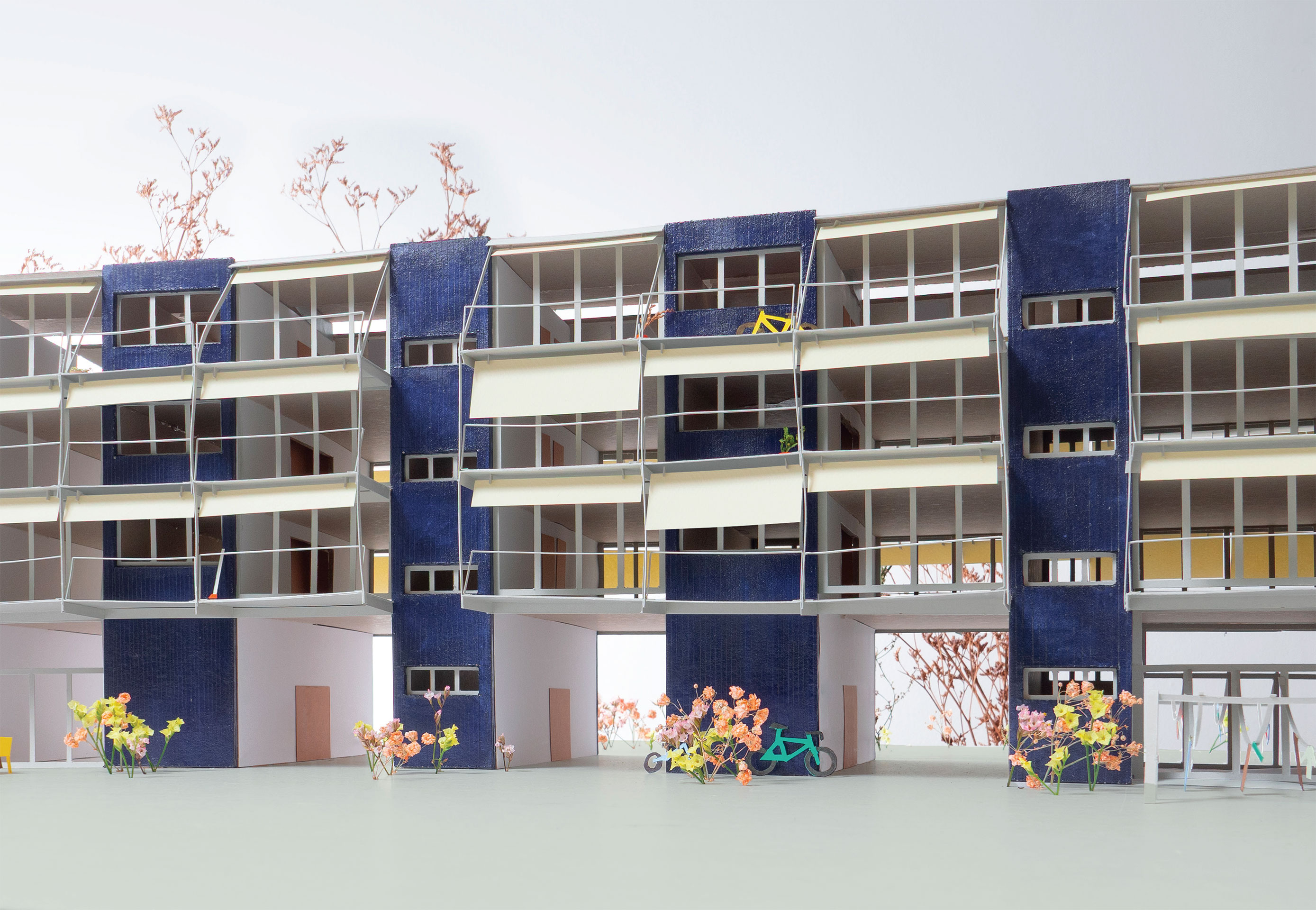 L’équipe des lauréat·es a choisi de conserver en partie la structure existante. La force du projet Darla réside en particulier dans son rez-de-chaussée. Alternant entre pleins et vides, offrant des espaces communs de plain-pied (buanderies, salle commune, locaux vélos), il lie efficacement l’avant à l’arrière du bâtiment, où coule la rivière. Cette porosité physique et visuelle est rendue possible par la suppression de la dalle du rez-de-chaussée, dont la matière concassée est réemployée pour combler le demi-niveau du sous-sol. Un rapport au sol est ainsi instauré, qui n’existait pas auparavant. Distribués par les noyaux d’escalier existants, les appartements traversants prévus aux étages sont prolongés des deux côtés par des balcons filants suspendus. Une surélévation en bois vient couronner le bâtiment, avec des appartements faisant jusqu’à 5 pièces. Finalement, le projet intègre des solutions bioclimatiques, comme la ventilation naturelle ou les toitures actives.