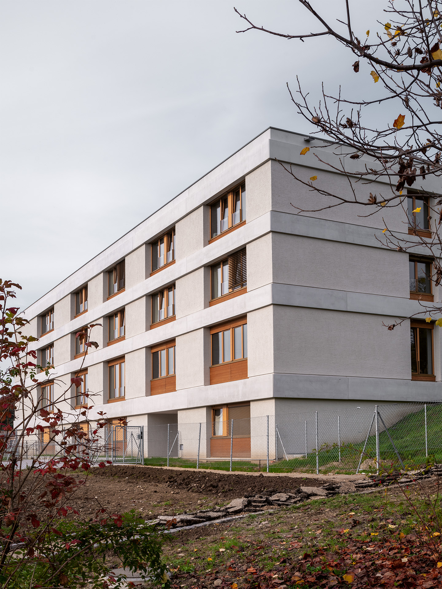 Au-delà de la réalisation des Clos d’Aubonne, il semble pertinent de prendre de la hauteur sur les projets d’EMS récemment construits, ou qui ont remporté le premier prix au cours des quelques années passées1. Le projet de Comamala Ismail à Bussigny actuellement en chantier, celui de l’Atelier Prati Zwartbol livré à Siviriez2 en 2024, la réalisation de gdap à Begnins en 2023, ou encore le projet primé en 2022 pour un nouvel établissement à Vuadens, aussi dessiné par gdap, partagent de nombreux points communs. Leurs gabarits sont similaires, tous adoptent la typologie d’un bâtiment a cour, rythment leur façade de façon semblable, et emploient les mêmes matérialités. Le bois, en particulier, est omniprésent — notamment pour les éléments au contact des résidents — dans le but d’apporter une certaine chaleur et d’atténuer l’ambiance institutionnelle. Les exigences programmatiques, les normes strictes et les contraintes expliquent en partie cette homogénéisation. Il serait difficile d’affirmer pour autant que les architectes ont relégué au second rang la créativité et la recherche typologique, mais nombre d’entre eux arrivent à des conclusions similaires. Sans doute ce modèle a-t-il fait ses preuves, répondant aux besoins des personnels comme des résidents.