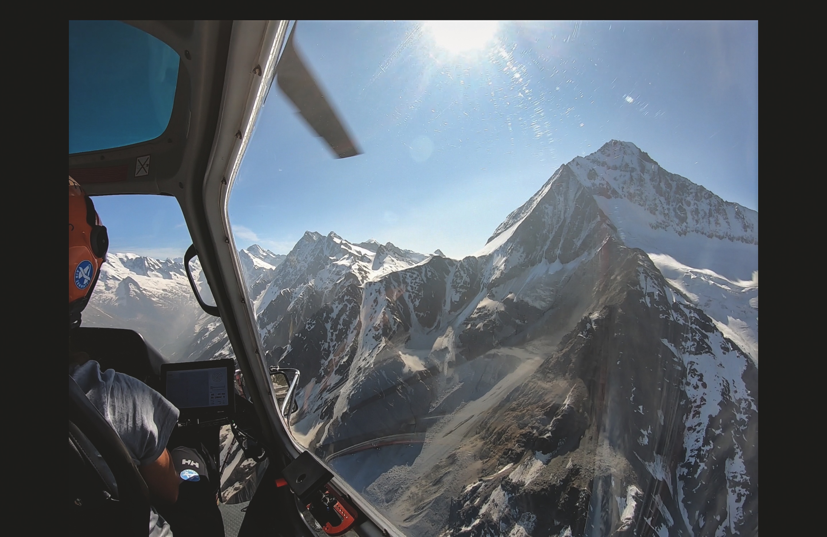 Après avoir connecté les câbles d’alimentation et de données, nous prenons place à bord de l’hélicoptère. Julien Vallet s’assure du bon fonctionnement de ses instruments de mesure avant de donner le feu vert à Julie May, notre pilote. La turbine siffle, le rotor se met en mouvement et nous voilà un peu plus tard à remonter le Bietschtal, un vallon sauvage du versant nord de la vallée du Rhône, en direction de la spectaculaire pyramide granitique du Bietschhorn (3934 m).