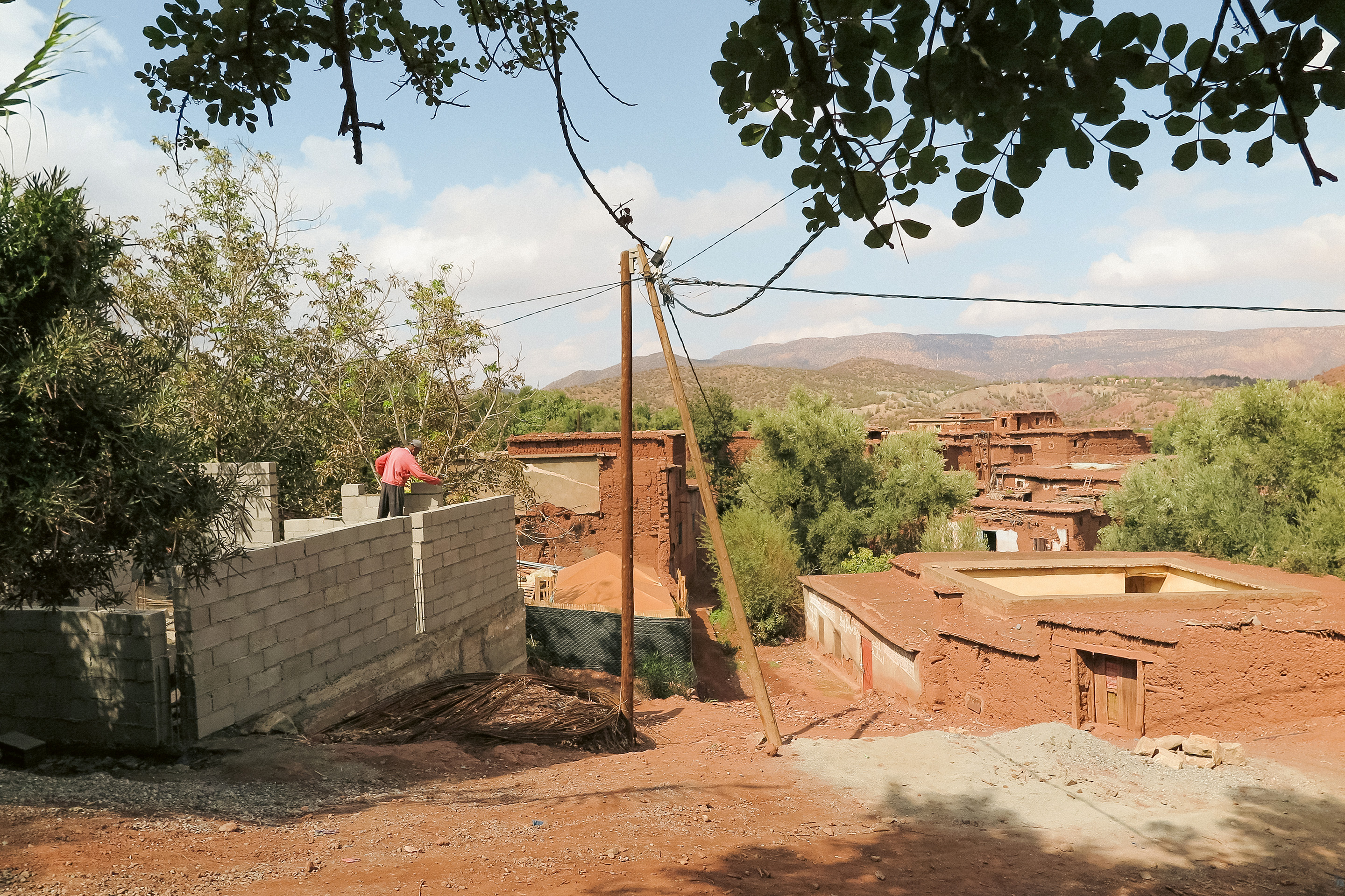 Pour la réédification, le gouvernement marocain a fourni à chaque foyer une aide financière d’urgence de 2500 dirhams (= 250 CHF) par mois pendant plus d’un an, plus 80000 pour les maisons partiellement détruites et 140000 pour les maisons entièrement détruites, afin qu’elles soient rebâties si possible à leur emplacement d’origine1. «Les fonds sont distribués par l’intermédiaire de Al Omrane [un groupe semi-public spécialisé dans l’aménagement urbain et la promotion immobilière], qui supervise l’appel à projets de reconstruction. Les paiements sont effectués en plusieurs versements, liés à chaque étape de l’avancement des travaux», explique Yasmine Sefraoui. Mais ce système a des effets pervers: l’attente entre chaque phase est très importante, puisque les travaux doivent être contrôlés sur place par un·e employé·e. Les habitant·es, qui recourent fréquemment à l’autoconstruction dans ces zones isolées, redoutent aussi que la qualité de leur travail ne soit pas reconnue comme suffisante pour percevoir la deuxième ou la troisième tranche des subventions. Ce phénomène fait obstacle à la reconstruction traditionnelle. Aujourd’hui, on édifie le plus souvent en béton, «ce qui est favorisé par les modèles standardisés fournis par les bureaux d’étude qui apportent leur assistance technique», commente l’architecte. Un phénomène qui entraine non seulement la perte d’un héritage architectural, étroitement lié à la culture amazighe2, mais aussi celle de ses avantages pratiques, tels que son faible impact environnemental et son adaptabilité au climat local.