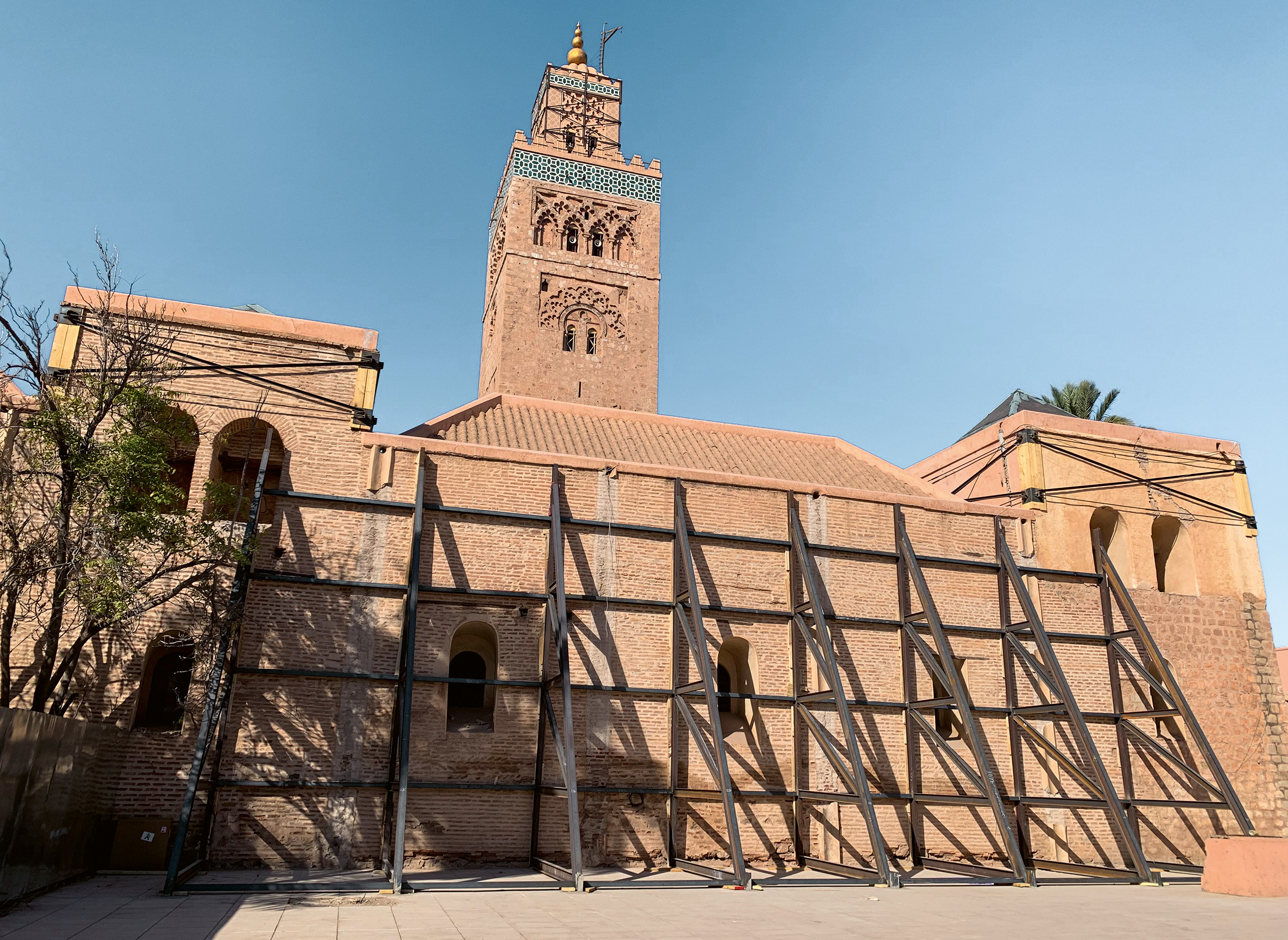 La plus grande mosquée de la ville est la mosquée Koutoubia, datant du 12e siècle; elle a été construite principalement en maçonnerie de briques, certaines parties des murs extérieurs étant construites avec des blocs de grès. Le minaret de 77 m de haut, en maçonnerie de pierre naturelle (grès), est de forme carrée et relativement élancé (rapport hauteur/largeur d’environ 5 pour 1). Après le séisme, des fissures ont été constatées dans la partie supérieure du minaret, qui a alors été stabilisé à l’aide de renforts en acier, cette mesure visant à empêcher l’augmentation des dommages en cas de nouveau séisme. Aussi, les balustrades ont également été stabilisées pour éviter qu’elles ne basculent et des étais soutiennent certains murs extérieurs de la mosquée. Sans accès au minaret ni à l’intérieur de la mosquée, il n’a pas été possible d’identifier tous les dégâts générés par le séisme.
