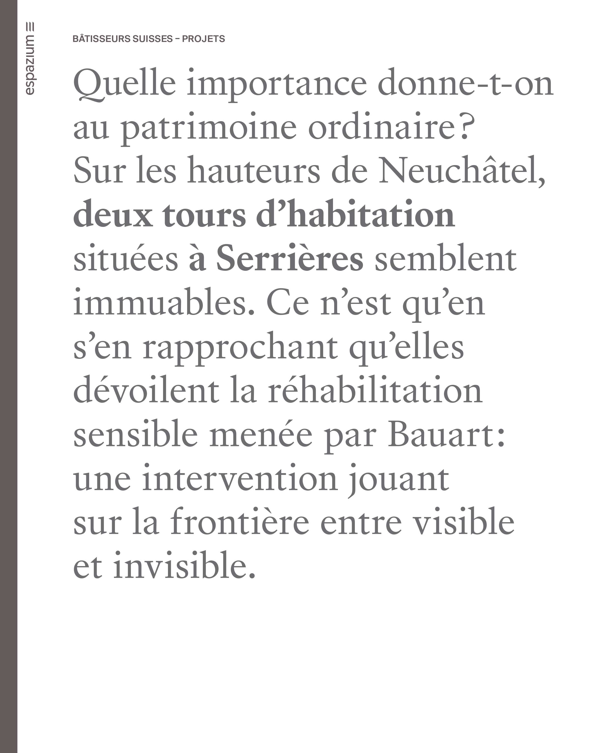 Ce cahier de la série Bâtisseurs suisses présente la réhabilitation de deux tours d’habitation à Serrières, Neuchâtel (NE) par le Bauart Architectes et Urbanistes: une approche sensible, par touches; une intervention jouant sur la frontière entre visible et invisible.