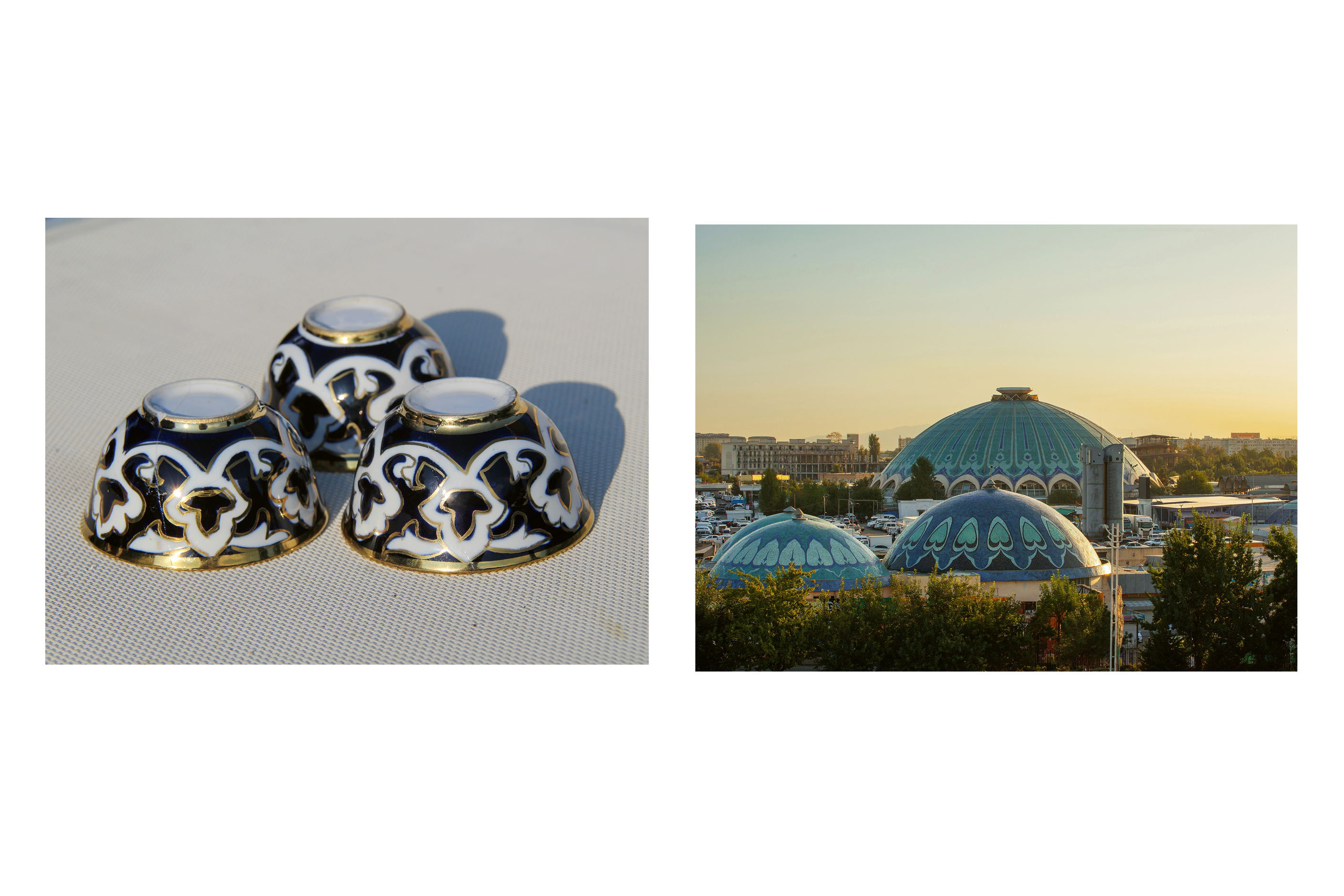 Storditi dalla canicola estiva, che oggi segna 45 gradi, il Bazaar di Chorsu a Tashkent emerge all’orizzonte come un miraggio cangiante, ricordando le antiche cupole azzurre della Via della Seta, ma anche molto altro. Da lontano potrebbero sembrare enormi tazzine, come quelle in porcellana vendute in ogni mercato dell’Uzbekistan, con sopra il motivo del fiore del cotone (Pakhtagul). Il cotone, in epoca sovietica, era tutto: Mosca infatti impose una monocoltura per soddisfare la domanda tessile dell’URSS, tale da provocare disastri ambientali come il prosciugamento del lago d’Aral per lo scellerato sfruttamento delle risorse idriche.