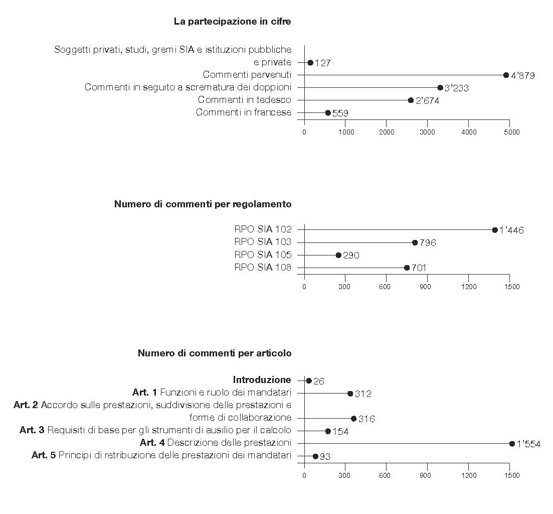 Gran parte degli oltre 3000 commenti pervenuti aveva come oggetto la descrizione delle prestazioni di cui all’articolo 4. Complessivamente i commenti sono stati comunque rilevanti per tutti e quattro i regolamenti, dal momento che lo scopo dell’armonizzazione è di rendere le basi degli RPO coerenti. Per tale motivo la verifica dei commenti deve avvenire in modo estremamente accurato e in un’ottica interdisciplinare.