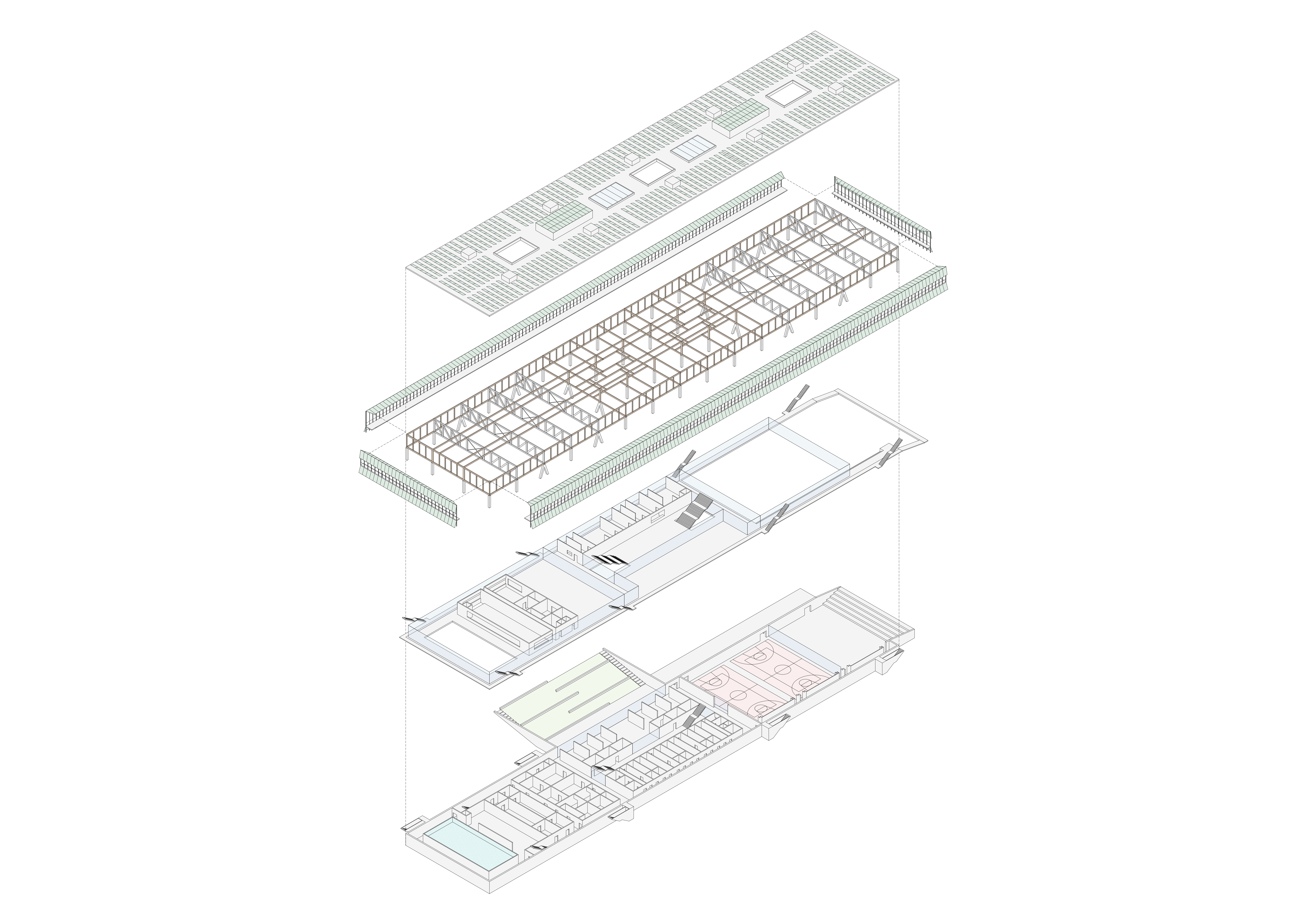 Tutte le aule si trovano al primo piano e si distribuiscono lungo i lati lunghi del volume, affacciandosi a est e ovest verso il parco. Al centro tra di esse si trova un grande atrio diffuso e continuo, con spazi d’incontro, corti a cielo aperto, collegamenti e servizi. Un ballatoio corre lungo tutto il perimetro, offrendo spazio per la ricreazione e fungendo da via di fuga esterna, permettendo così di concentrare all’interno dell’edificio solo due scale centrali.
