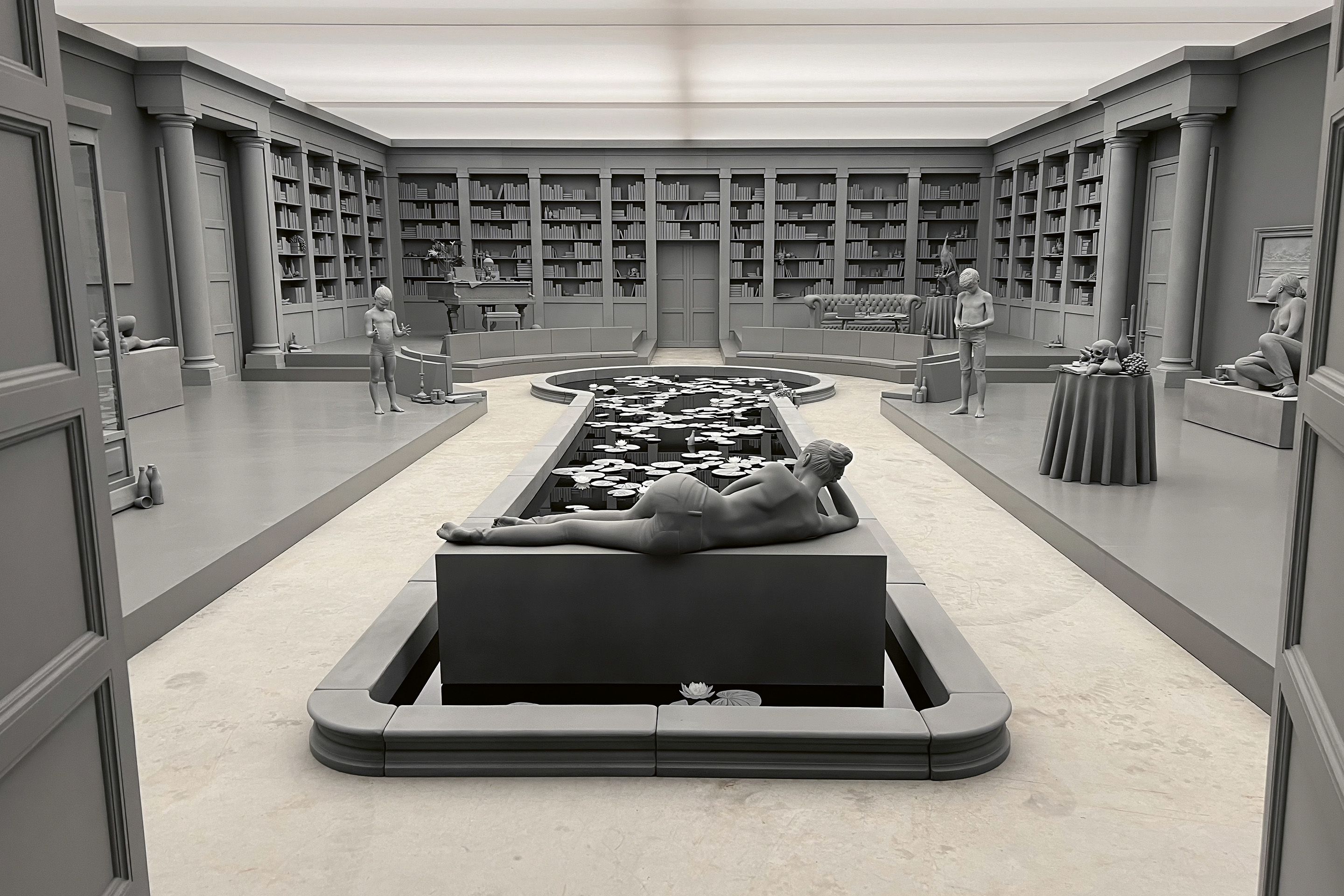 L’edificio è concepito per ospitare due sole opere d’arte: Nature Morte – Ray di Subodh Gupta, nel foyer, in prossimità dell’ingresso, e The Collector’s House di Hans Op de Beeck, all’interno del padiglione. L’opera dell’artista belga, ideale archetipo delle collezioni d’arte o delle sale da ricevimento, realizzata con mezzi espressivi e linguaggi tipici della modellazione tridimensionale, dà forma a una scena volutamente priva di qualsiasi effetto materico o coloristico, dalle superfici omogenee, lisce, interamente in gesso grigio monocromo. L’esito è quello di uno spazio spaesante dalle fattezze iperrealistiche; il tutto è accentuato dalla luce artificiale diffusa, che contribuisce allo straniamento, escludendo qualsiasi contatto o relazione con il mondo reale.