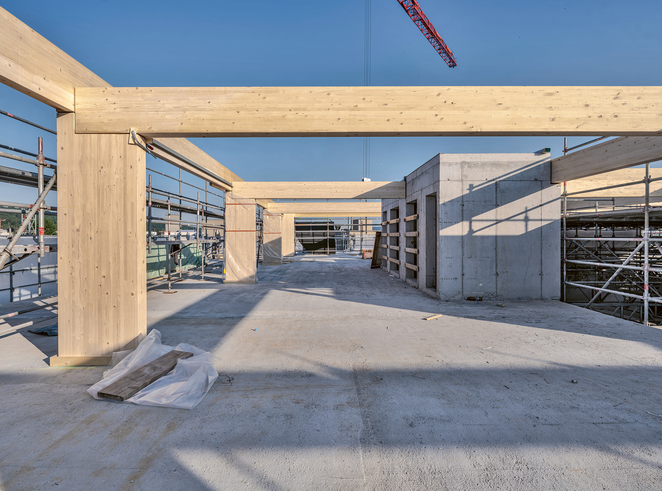 La superficie al centro, poco illuminata e difficilmente affittabile, viene ridotta per la realizzazione dell’atrio e compensata dalla sopraelevazione del sesto piano, arretrata sui quattro lati esterni e realizzata in costruzione leggera in legno, in posizione privilegiata con vista a 360° sulla città. Questo valore aggiunto è reso possibile esclusivamente dalle caratteristiche del volume esistente: il rispetto del profilo degli attici a 45°, unito alla notevole profondità della pianta, consente infatti di ricavare superfici pienamente fruibili attorno all’atrio centrale, completate da un’ampia terrazza perimetrale. La sopraelevazione si basa sulla maglia strutturale dei pilastri esistenti ed è possibile senza ulteriore rinforzo della struttura portante, grazie alla massa ridotta della costruzione in legno, nonché al dimensionamento per i carichi industriali previsti in origine. I solai prefabbricati Lignatur, con luce di 7,20 m, rendono visibile la struttura lignea anche all’interno, contribuendo a un dialogo materico tra legno e cemento e accentuando la leggerezza complessiva del volume superiore.