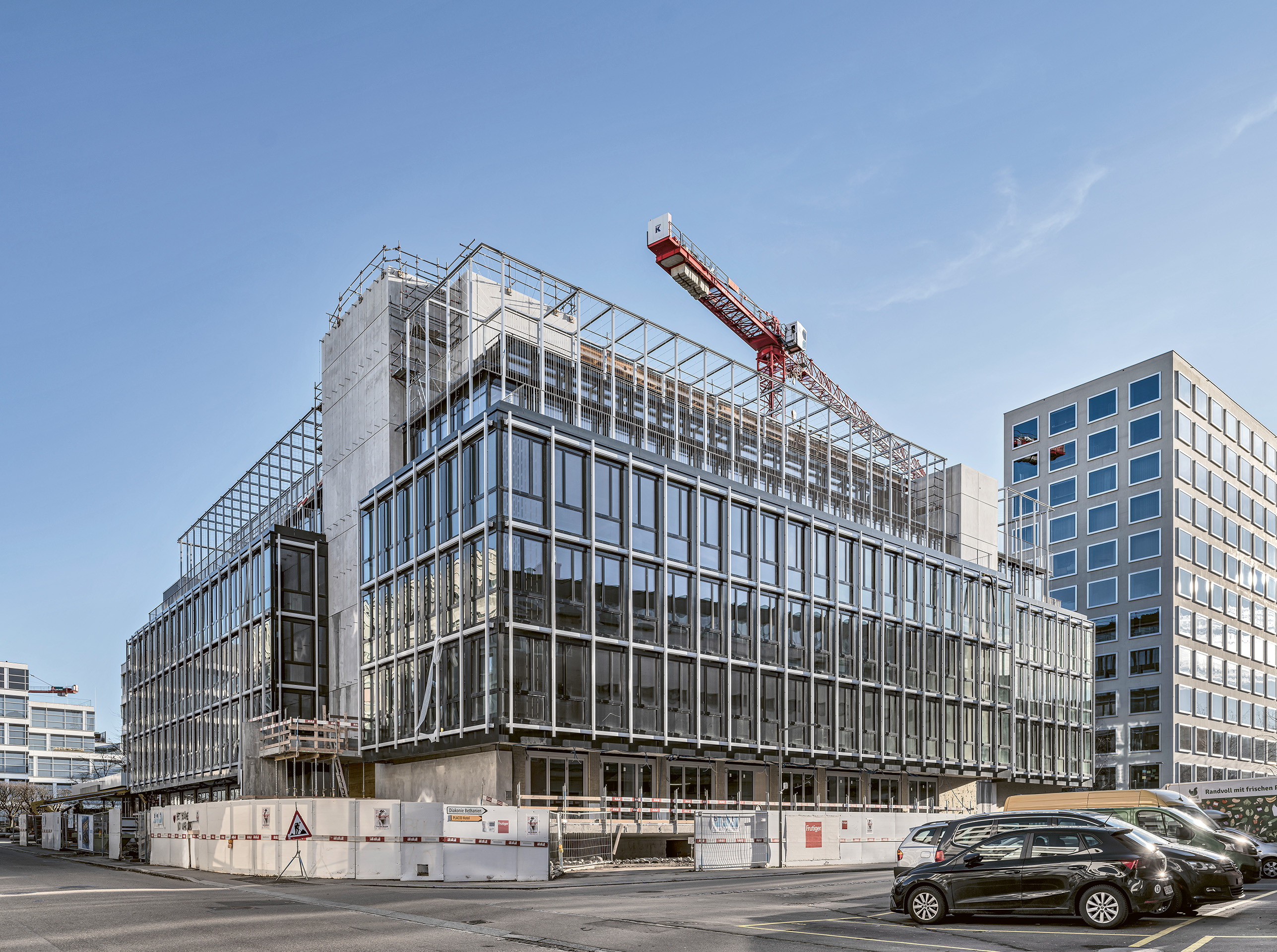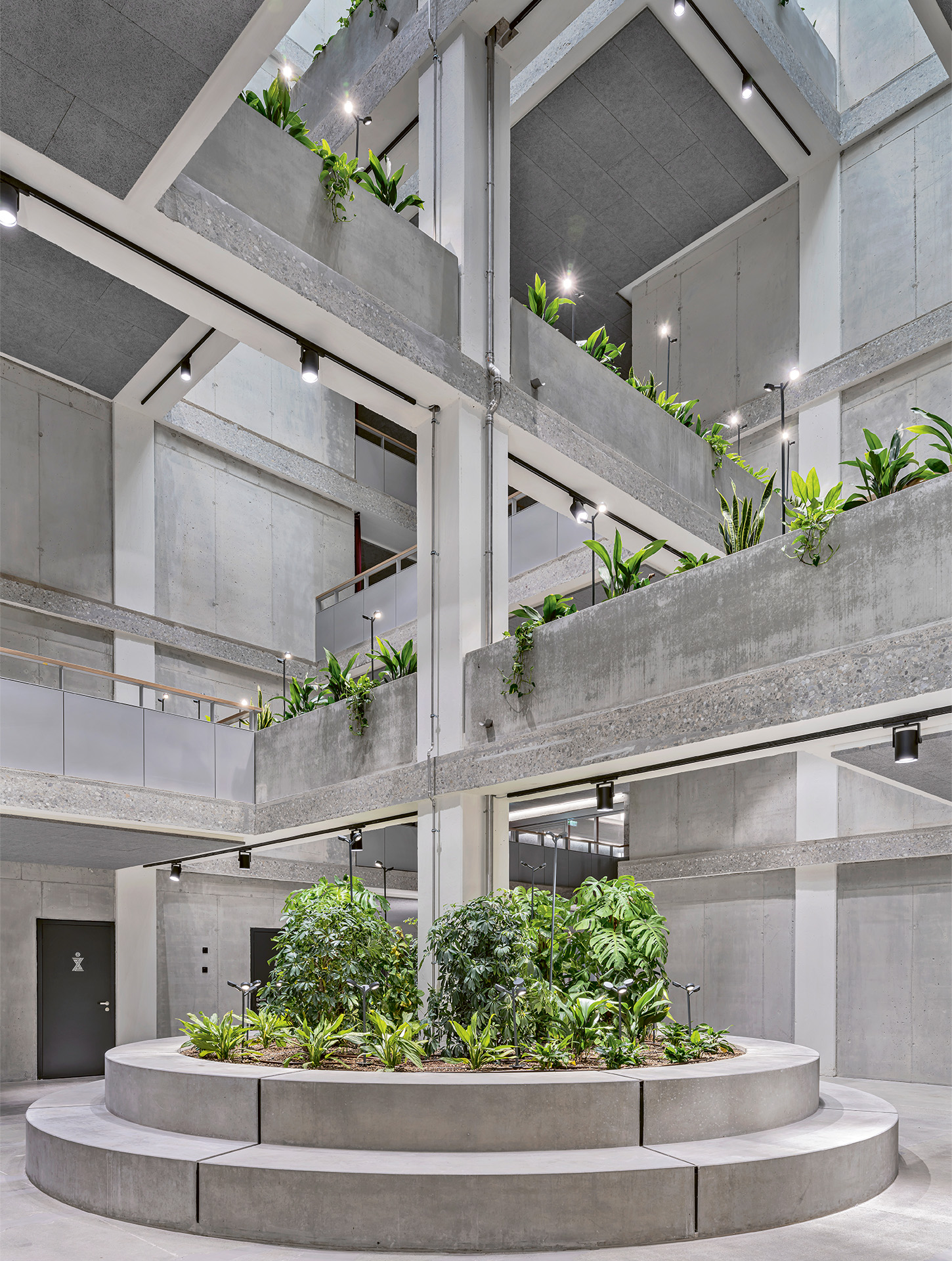 Nel segno dell’approccio «Reuse, Reduce, Revaluate» (cfr. pp. 38-39), che ne definisce i parametri progettuali, l’edificio degli anni Sessanta è stato completamente ripensato e reinterpretato, ottenendo lo standard è DGNB-Gold. Attraverso interventi architettonici mirati vengono ridefiniti gli accessi, l’espressione e l’organizzazione interna, con l’obiettivo di creare un edificio contemporaneo che valorizzi la struttura esistente. Durante il cantiere, la costruzione viene ridotta alla struttura portante originaria e, nello scheletro messo a nudo, viene ricavato un atrio alto sette piani che introduce luce naturale zenitale all’interno dell’edificio, la cui pianta quadrata di 50 m di lato presenta una notevole profondità. L’atrio, concepito come ambiente aperto per il lavoro e l’incontro, con le terrazze interne che si protendono nel vuoto, costituisce il cuore dell’insieme e crea un’identità condivisa tra tutti i livelli, favorendo connessioni visive e funzionali tra spazi operativi, zone comuni e percorsi verticali. Il pilastro centrale diventa il perno del sistema strutturale e segna l’intersezione delle travi principali, disposte in alternanza ogni due piani e rinforzate da elementi prefabbricati che accolgono vasche strutturali dotate di una ricca vegetazione interna (cfr. p. 43), introducendo un microclima naturale e un filtro visivo verso le aree di lavoro circostanti.