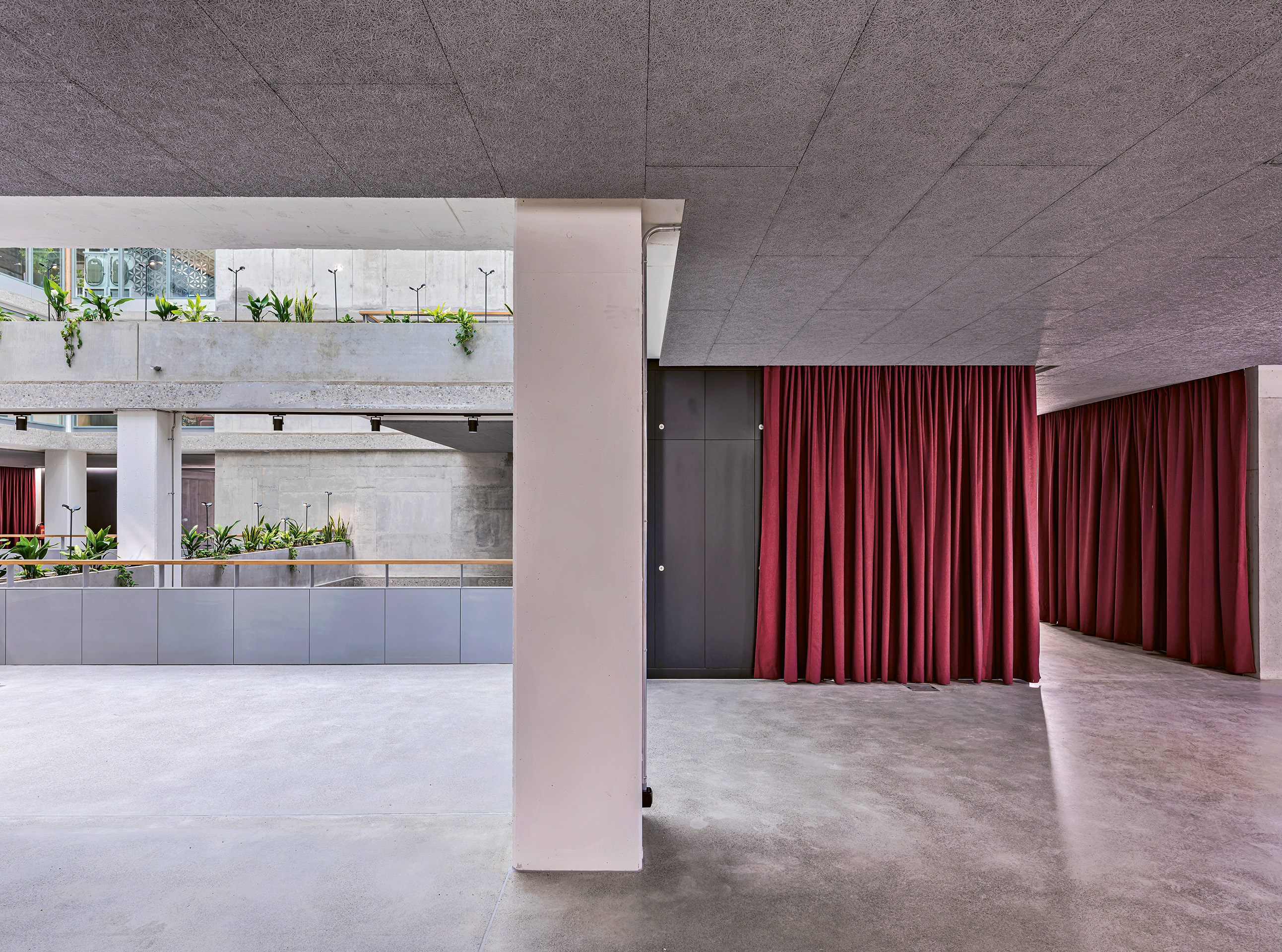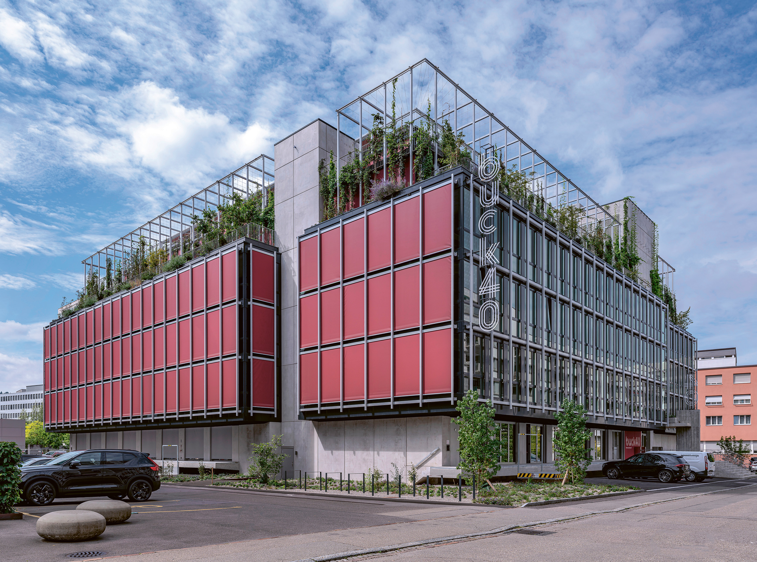 Gli aggetti esistenti al piano rialzato vengono trasformati in piattaforme di carico per gli spazi produttivi grazie alle nuove facciate arretrate. Anche l’accesso viene trasferito dal piano seminterrato al piano rialzato e, insieme alla nuova pergola, alla facciata in acciaio e tessuto rosso e ai giardini pensili, assume un carattere più rappresentativo e fortemente identitario, ridefinendo l’immagine dell’edificio. La distribuzione avviene in modo significativo tramite il vano scala principale esistente con nuova illuminazione zenitale. La pregevole scala a cosciali, le lastre in pietra artificiale e il ­parapetto leggermente adattato con corrimano in legno massiccio vengono riutilizzati. Il branding specifico dell’edificio, con la scritta lineare «buck40» applicata in facciata attraversa l’intero edificio come sistema segnaletico e contribuisce, insieme alla nuova espressione esterna e all’atrio, a dare all’edificio un carattere distinto, rafforzandone da una parte la riconoscibilità nello spazio urbano e dall’altra impreziosendo la qualità degli spazi interni.