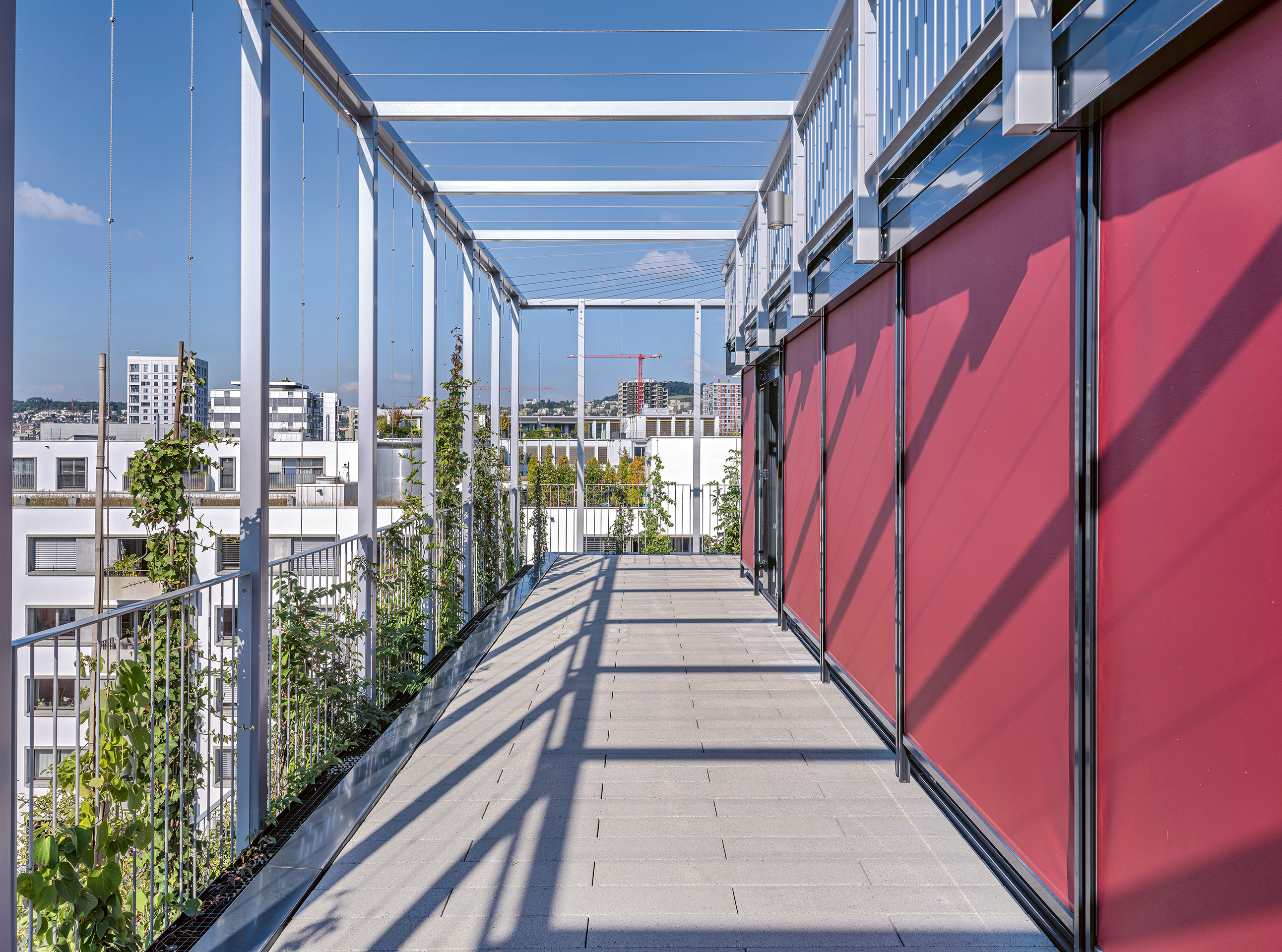 L’edificio è articolato verticalmente in tre parti: sopra il piano terra arretrato aggetta ora un volume di tre livelli. Oltre si dispongono, arretrando progressivamente, i piani attici con rigogliosi giardini pensili. La facciata prefabbricata in cemento esistente viene sostituita da un curtain wall scuro, con finestre a tutta altezza, che assicura abbondante luce naturale ai piani. Alla facciata viene anteposto un telaio metallico chiaro e distintivo che garantisce la protezione solare estiva tramite tende verticali di colore rosso e, allo stesso tempo, crea continuità visiva con la struttura-pergola a due piani delle terrazze a gradoni, introducendo giochi di trasparenza e profondità che valorizzano la percezione tridimensionale dell’involucro.